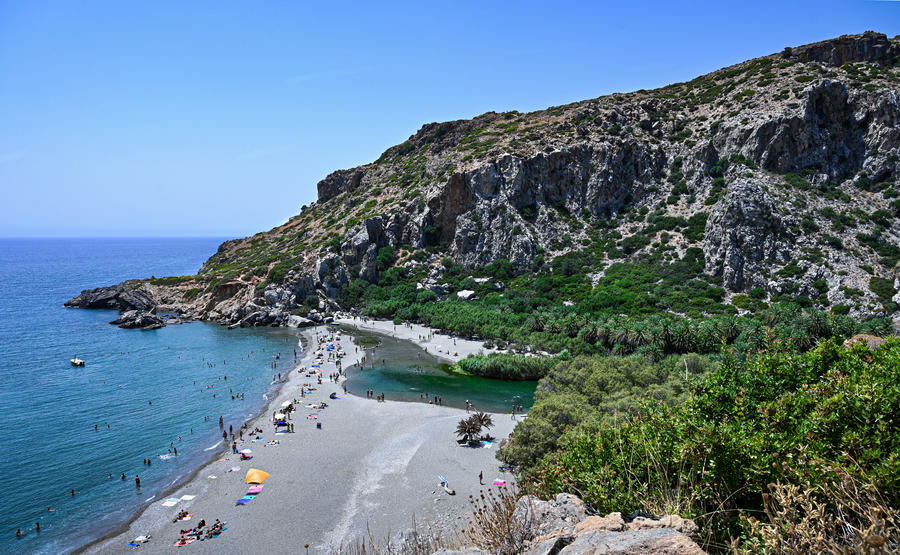 The Preveli Palm Forest is one of Crete’s most unique natural landscapes. Following the path along the Kofinos River, you will encounter thousands of palm trees forming a lush green canopy, perfect for photos and relaxing in the shade. The river flows into a small beach where its fresh waters meet the sea, creating a remarkable spot for swimming or simply enjoying the serenity of nature.